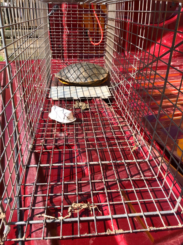 After several monthly visits, checking the bait stations multiple times per week, I thinned out the vole population. We – I mean the city maintenance guy – filled in all the burrows we could find. To date: I have removed four raccoons, and three opossums from the facility. There are turtles swimming in the sewer muck, and this reptile made its way into my trap:
