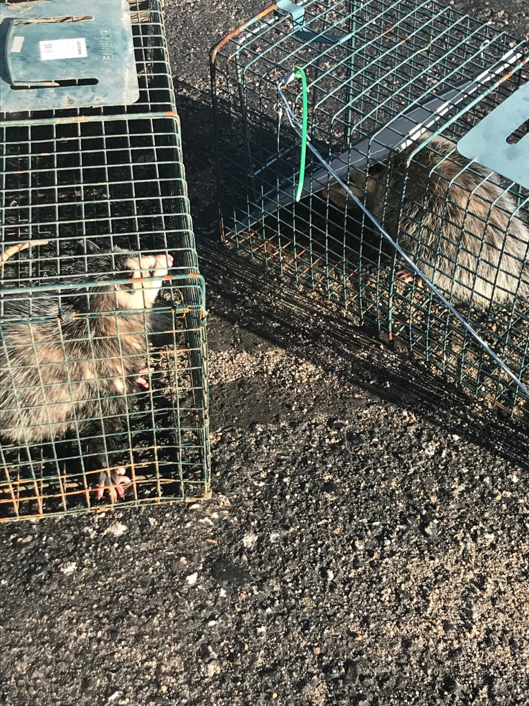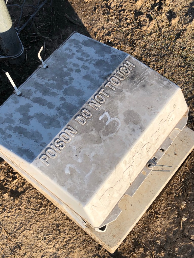 I know, you are thinking about the 100 feet rule on rodenticide. Well, here’s my logic – that fence is NEVER gonna move. It HAS to stay put. That’s part of the rules and regulations for the Environmental Protection Agency. So, I am within my 100 feet of the man made structure criteria. I added large snap traps in every other station, and set two cage traps with cat food and deer corn.