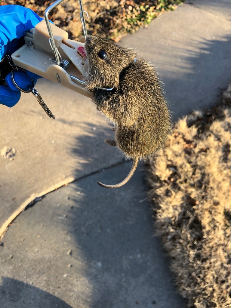 Curious what I might catch, I checked these bait station placements three times in the first week. There was a lot of feeding, but no rodent of any kind. The second week, I got lucky. Maybe not so much luck, but waiting on the rodents getting used to something new. This little guy wasn’t so fortunate: