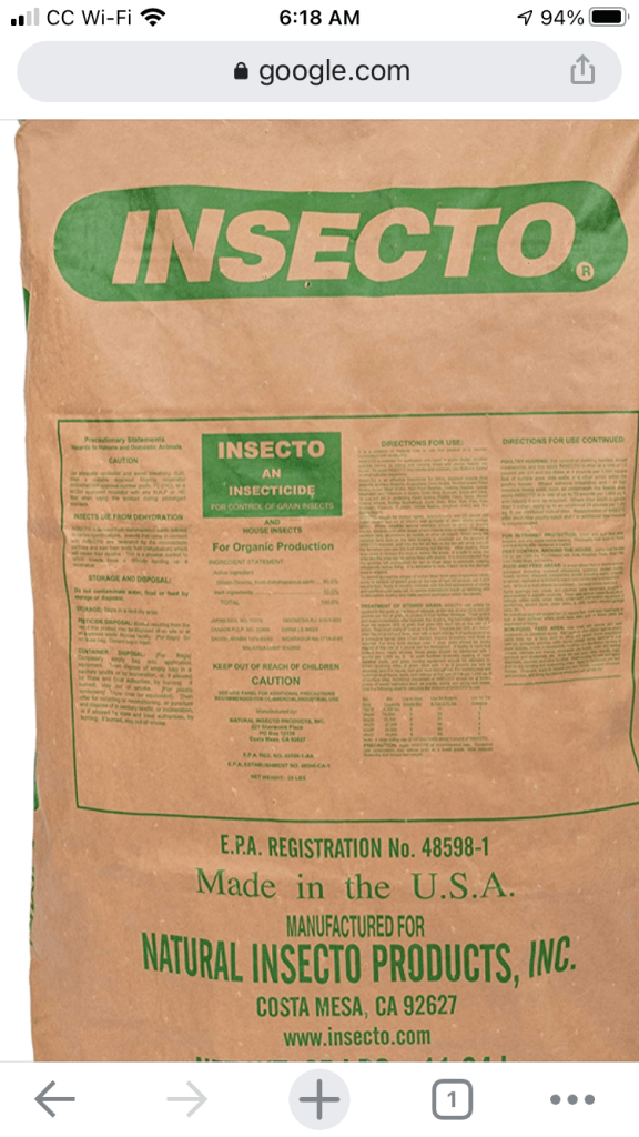 The INSECTO label lists multiple approved locations for application. “Work into carpets, furniture, mattresses…. Then vacuum. Can be applied to trucks, boxcars, and ships.” DE can be applied, sometimes, as frequently as bi-weekly. It can be mixed in a spray bottle with water to treat head lice. Damn!
