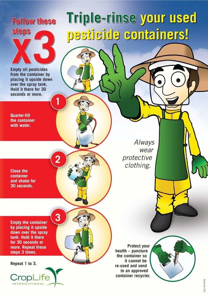 Store products upright. Secure them out of sight when not in use. Those contents shouldn’t be in the wrong hands. Triple rinse – triple rinse – TRIPLE RINSE empty containers. Recycling of jugs, bottles, or cartons is permitted if there is a facility to accept such waste.