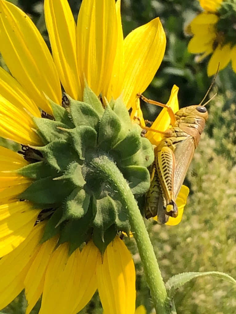On the back part of our 3 acre property, there are some wild sunflowers growing. I dead headed them to save the seeds. I know they will be extra tall, so those will go under my kitchen window. The sunflowers already had some pollinators attached to them. Several butterflies, a grasshopper, and a bumblebee were among the crew.